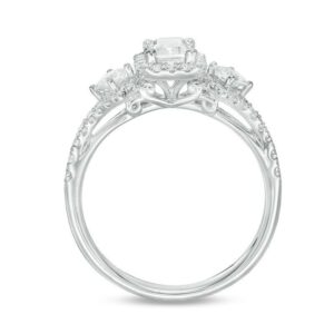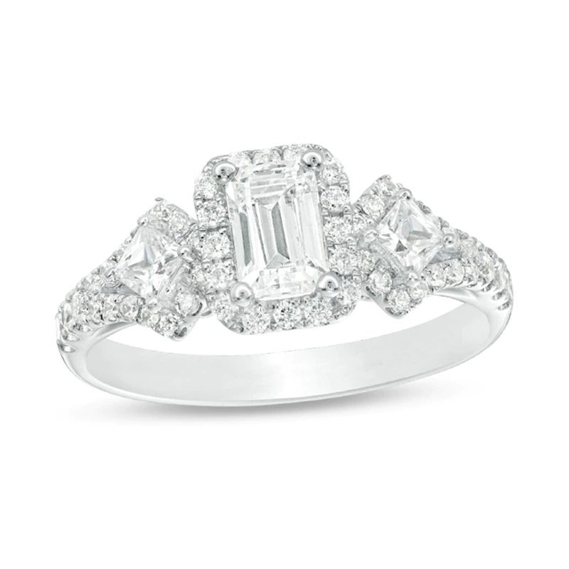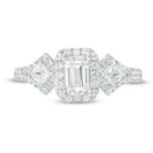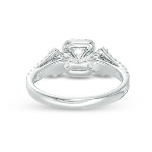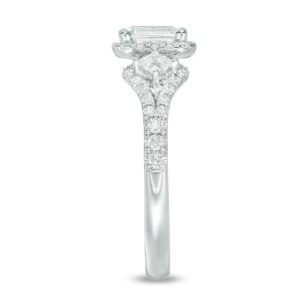 honor her with the sparkling look of this diamond engagement ring. Crafted in 14K white gold, this elegant choice features a 1/2 ct. certified emerald-cut diamond flanked by 1/10 ct. princess-cut diamonds – all boasting a color rank of I and clarity of I1. Smaller diamonds decorate the design. and set with two accent diamonds, a beautiful reminder of your promise to always be by her side. Radiant with 1 ct. t.w. of diamonds and a brilliant buffed luster, this engagement ring is a beautiful reminder of your love. This style arrives with a certificate that includes a photo and description of the diamond, which guarantees quality and can be used for insurance purposes.