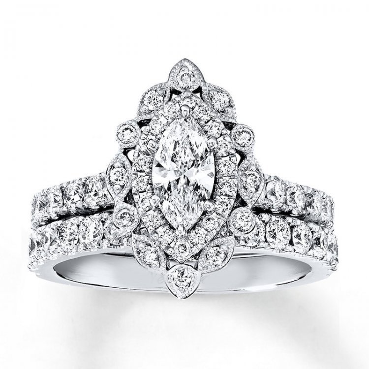 This vintage-inspired engagement ring showcases a marquise diamond traced in round diamonds, further framed in additional diamonds outlined in milgrain detail. More round diamonds accent the profiles and line the 14K white gold band and matching wedding band. The bridal set has a total diamond weight of 1 3/4 carats, and each ring is hand-crafted and undergoes a four-step process which gives the ring its beautiful shine and luster. Both rings have signature inside the band.
