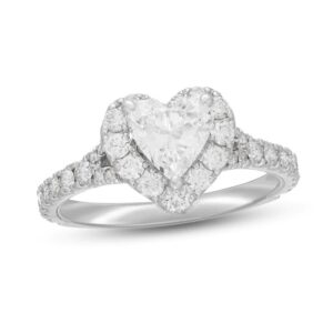 Take their breath away with the romantic sparkle in this magnificent engagement ring from the Neil Lane Bridal? collection. An endearing heart-cut diamond radiates from the center when sweetly embraced by a halo of bright round-cut diamonds. The lovely center is perfectly perched amidst its classic band traced with brilliant round diamonds. Crafted in iconic 14K white gold, the ring has a total diamond weight of 1 3/8 carats.