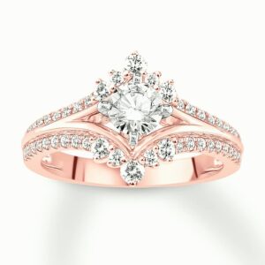 This captivating engagement ring has a unique design with royal-inspired flair. The 1/2-carat round diamond center sparkles between chevrons of 14K rose gold. More shimmering diamonds enliven the outer edges of the band, bringing the total diamond weight to 7/8 carat. The center diamond is set in 14K white gold.