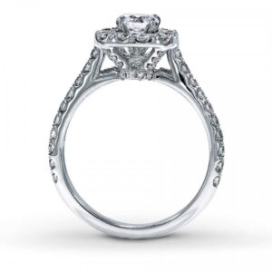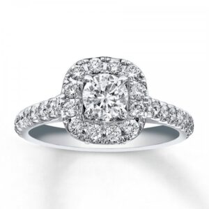 Round diamonds brilliantly frame a picture-perfect round diamond, with a line of round diamonds fanning out on either side. Fine jewelry rings are handcrafted and undergo a four-step polishing process to give each ring its beautiful shine and luster. This engagement ring has a total diamond weight of 1 1/8 carats, and is set in 14K white gold. Available online while supplies last. Previously Owned Treasures are not eligible for in-store pick-up. Previously Owned Treasures may only be shipped either to your home address or to an alternate address.