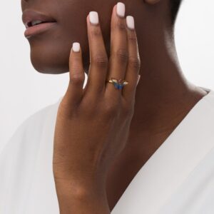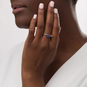 JewelrydesignerbringsArtDecostyleintothemodernerawiththisincredibleengagementring.Theemerald-cutnaturalsapphirecenterisframedbyrounddiamonds,whiletriosofbaguettediamondsshimmeroneithersidetocomplement.Thebanddisplaysmorerounddiamonds,delicatebeading,andcarvedflourishestocompletethedesign.Styledin14Kwhitegold,theringhasatotaldiamondweightof1/2carat.